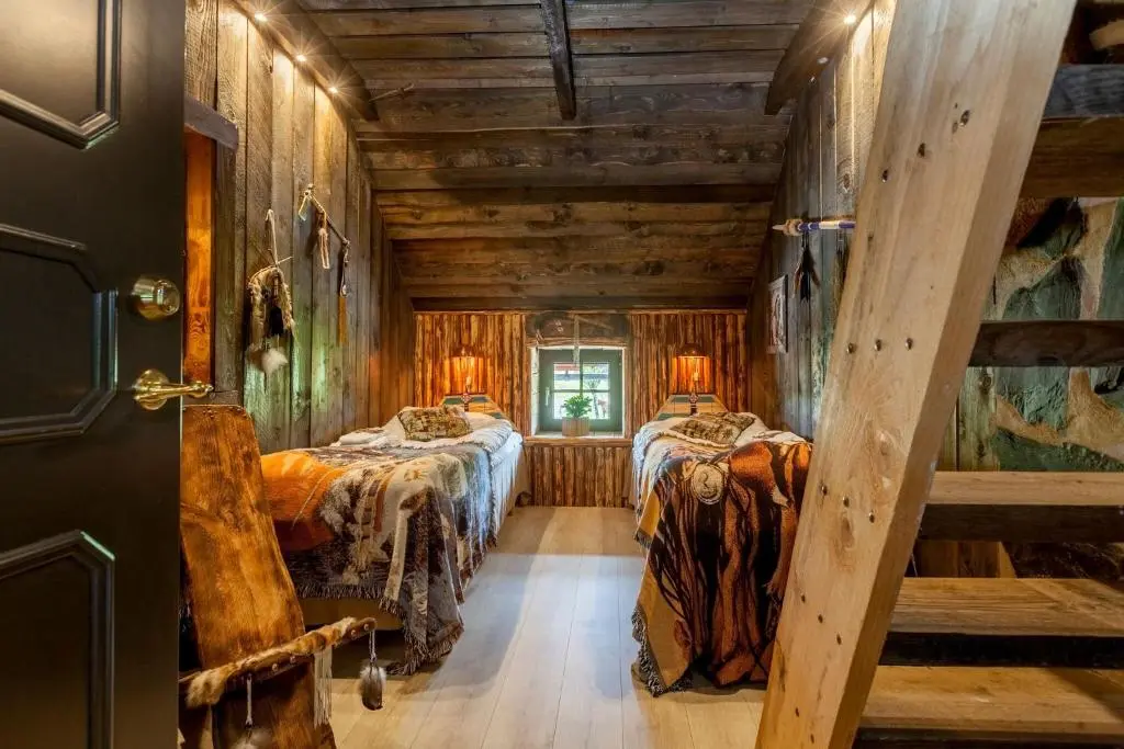 Uppe bland molnen hittar du Eagle Room, ett 4-bäddsrum som passar perfekt för familjer med barn i åldern 5–12 år. Två av bäddarna är placerade skavfötters på det mysiga sovloftet, vilket ger rummet en lekfull och äventyrlig känsla. Här bor ni bekvämt med plats för både vila och gemenskap efter dagens upplevelser.